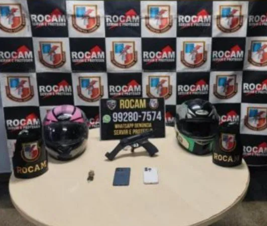Ao perceber a chegada da equipe, o homem tentou se esconder debaixo da cama, mas foi encontrado e preso. Com ele, foram apreendidos um iPhone 16 Pro Max roubado, a motocicleta usada no crime, um simulacro de arma de fogo e dois capacetes.