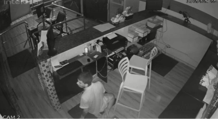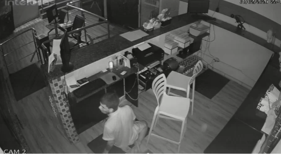 Câmeras de vigilância registraram o momento em que o homem entra na academia por volta das 22h. Nas imagens, ele aparece na área da recepção, onde começa a revirar o local em busca de objetos de valor.